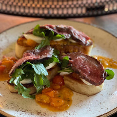 Heirloom Cherry Tomato and Roasted Beef Bruschetta