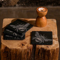 These beautiful, hand-crafted square slate coasters have each been engraved with a beautiful hand-illustrated drawing of honey bees. These unique and quirky slate coasters make a lovely table piece for your guests to set their drinks on.