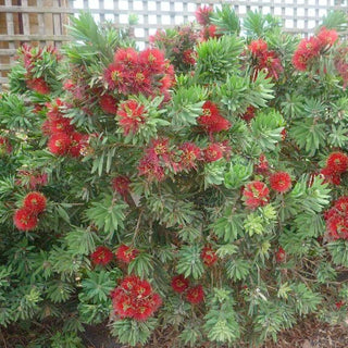 Blood red, bottlebrush-like flower spikes cover this dwarf evergreen shrub from spring into summer. In warm, temperate regions, it will continue to bloom intermittently throughout the year. A densely branched habit with blue-green leaves that have a citrus scent when crushed. The versatile compact size is perfect for today's smaller gardens.