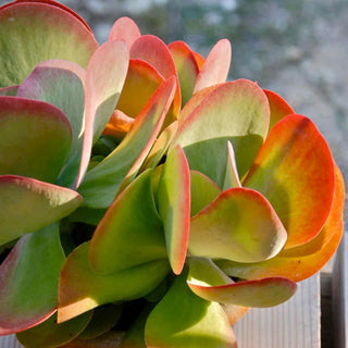 Prized for its thick, round, paddle-shaped succulent foliage, with a chalky blue-green color and red tinge that intensifies in full sun. Clusters of yellow flowers on spikes appear on mature plants. Provides dramatic color and texture in rock gardens or xeriscapes. Easily grown in containers, indoors or out. A frost-tender evergreen.