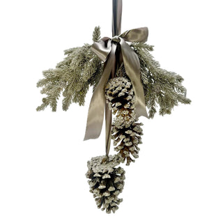 Elevate your seasonal decor with our Triple Pinecone Swag—where rustic charm meets a touch of glam. Three natural pinecones are nestled below a cluster of pine needles; each delicately dusted with German silver glass glitter that catches the light like freshly fallen frost. Tied together with a wide, sumptuous gray satin ribbon bow, this swag is the perfect blend of elegance and earthy appeal. Hang it on a door, mantle, or window, and let it add a sparkling, wintry whisper to your holiday home.