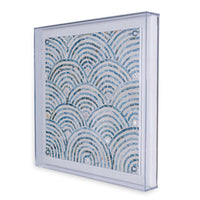 Scottsdale Panel features hand finished and lacquered mother of pearl veneer on wood. The light blue/gray mother of pearl panel is attached to a cotton/linen wrapped upholstered interior board and mounted under our 2.5" deep lucite shadow box frame. The Scottsdale panel is finished with a silver nail head detail in each corner.