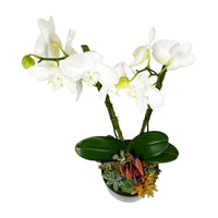 Bring the beauty of the season indoors with Orchids & Succulents in a Small Black Pot, a stunning piece that blends elegance with rustic charm. The contrast of delicate orchid blooms and hardy succulents creates a balanced design that feels both graceful and grounded. The sleek black pot enhances the warm autumn tones, making it a versatile accent for any space.