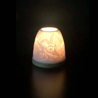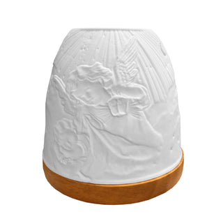 The lantern attachment made of the finest white porcelain has been delicately processed and harmonises with the natural-colored wooden base. During production, thin layers of porcelain are stacked on top of each other, creating breathtaking motifs in relief design.