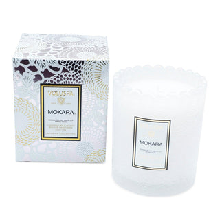 Notes of Mokara Orchid, White Lily and Spring Moss. Beautiful scalloped edges on an embossed glass that can be used long after the candle is gone. Burn time approximately 50 hours.