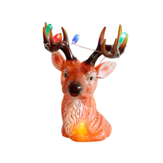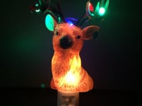 Plastic holiday night light depicting a reindeer with antlers. Night light plugs into a standard outlet and has an on/off switch. Light is at the center of the reindeers neck. Strand of lights around the antlers also lights up.