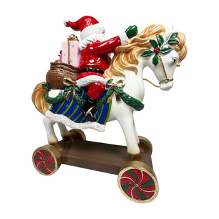A Santa Riding Horse with Wheels — standing 16" tall — brings whimsical charm to any holiday setting. Its playful design, featuring Santa joyfully perched atop a rolling horse, instantly captures the magic and nostalgia of Christmas. The movement-ready wheels add an interactive touch, making it a delightful décor piece that appeals to both children and adults.