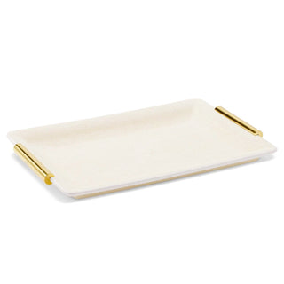 This shallow shagreen vanity tray has two integrated handles made of brass in a stylish cylindrical shape. A perfect place to organize personal belongings on a dressing table or desk.