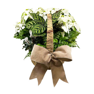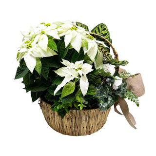 The White Poinsettia Handle Basket captures the elegance and serenity of the holiday season with its pristine princettia white poinsettia surrounded by lush green foliage and ferns. Beautifully arranged in a natural sea grass basket and adorned with a luxurious mink velvet bow, this arrangement embodies timeless holiday charm and sophistication.
