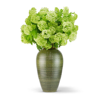 This hand-thrown large round vase has been enhanced using a glazing technique that provides a textured, natural appearance, giving it an overall artisanal appeal. Elevated by a hand-painted gold rim, it adds character to a table arranged with full blooms, such as hydrangeas.