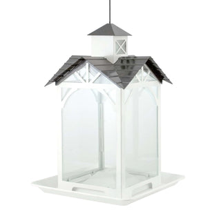 A vintage farm stable is reproduced in this metal and glass bird feeder. This charming black and white feeder holds up to 4 lb. of mixed seed - birds can feed from all four sides. Easy top fill with glass sides let you monitor seed level. Ready to fill and hang.