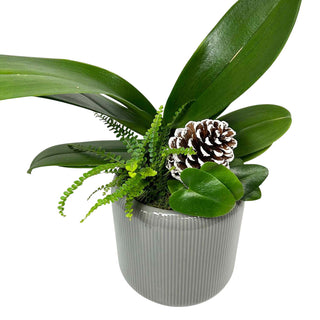 The White Orchids in a Large Grey Ribbed Pot make for an elegant and memorable holiday gift, perfect for adding beauty and calm to any space. Their crisp white blooms symbolize peace, renewal, and grace—qualities that resonate deeply during the holiday season. Paired with the modern grey ribbed pot, this arrangement blends effortlessly with any décor style.