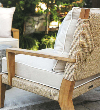 Hadley is a modern interpretation of classic 20th Century American furniture. Frames are crafted from premium Grade A teak using precise mortise and tenon joinery. Seating surfaces are handwoven in all-weather wicker designed to look like authentic rope. The woven portions feature a traditional triangular pattern, creating another layer of design. Deep seating units require cushions, while dining chairs are comfortable with or without cushions.