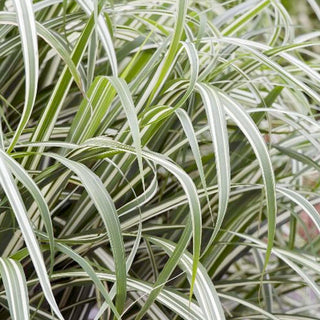 Rich green broad blades have conspicuous milky white stripes - a very showy ornamental grass that will assuredly add drama to the landscape. Copper-colored plumes appear above the foliage in early fall, age to a cream color on stems that blush pink as they mature. A bold accent or focal point for the garden.