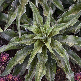 This hybrid plant offers the attractive structure of Agave and the faster growth and exciting colors of Manfreda. Small, burgundy-purple spots dot the broad, undulating foliage. Can tolerate more water than other succulents, provided excellent drainage. Evergreen.