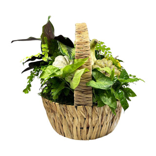 A White Autumn Pumpkin with greens and ferns nestled in a charming basket brings a touch of natural elegance to any fall setting. The soft white hue of the pumpkin contrasts beautifully with the lush greenery and textured ferns, creating a sophisticated yet cozy display. It’s a refreshing twist on traditional autumn colors, perfect for brightening tables, mantels, or entryways.