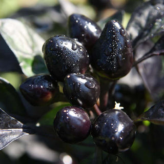 A beautiful plant with black on black foliage and pearl-like peppers, making them fabulous ornamental plants with a surprising kick of heat!