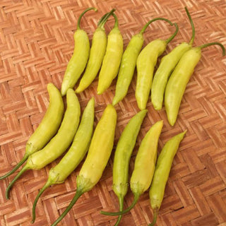 A very rare species of hot pepper. Long, waxy-yellow fruit ripen to a classic orange-red. The immature peppers are especially flavorful with a unique earthy-citrus bite that is not overly spicy, but definitely packs a punch when fully ripe. An excellent frying pepper at all levels of ripeness, they also make tasty dried pepper flakes after ripening to a bright red.