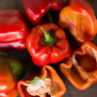 Good yields of giant 8" long by 4" wide elongated sweet peppers. Peppers are very sweet, have thick walls, and turn from green to bright red when mature. The pepper is so incredibly large that chefs can make two stuffed peppers from one pepper! The earliest giant pepper plant on the market. Excellent for salads and stuffing. Impress your neighbors and friends by growing a giant sweet pepper.