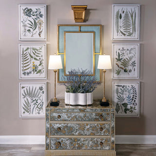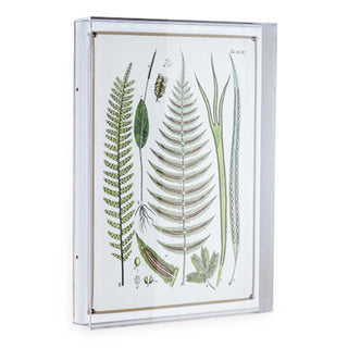 The artwork features a giclee print mounted under a 2.5" deep lucite shadow box. Attached to a linen wrapped interior panel, the artwork is finished with brass nail head in each corner.