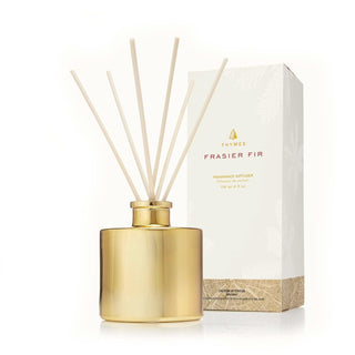 Perfectly sized to fill cozy spaces with the crisp fragrance of Frasier Fir, this Gold Petite Reed Diffuser is a stunning accent piece for any home.