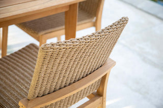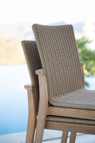 The Balboa Bay wicker chairs are designed with a sturdy stainless steel reinforced teak frame, providing exceptional durability and support. This innovative construction ensures a comfortable seating experience without the need for cushions, as the frame and wicker work together to offer natural resilience and ergonomic comfort. The teak, known for its strength and weather resistance, combined with stainless steel reinforcement, makes these chairs ideal for prolonged outdoor use, maintaining both form and function over time.