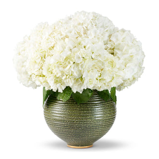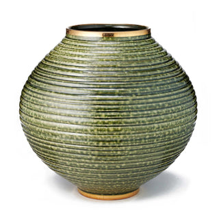 This hand-thrown large round vase has been enhanced using a glazing technique that provides a textured, natural appearance, giving it an overall artisanal appeal. Elevated by a hand-painted gold rim, it adds character to a table arranged with full blooms, such as hydrangeas.