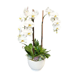 The Orchids and Succulents in Large White Swirl Pot from Roger's Gardens is a stunning and thoughtful gift for the summer season. This artful arrangement pairs the elegance of blooming orchids with the sculptural charm of succulents, creating a vibrant display that’s both refreshing and long-lasting. Set in a modern, white swirl ceramic pot, it complements any home or patio décor with sophistication and natural beauty.