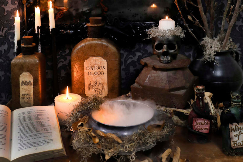 Massive iron gates, tarnished with age, ward off the faint-hearted. As you step inside the thick scent of age-old herbs hangs heavy, while the feeble glow of candles unveils walls lined with potions and mysterious books filled with incantations.