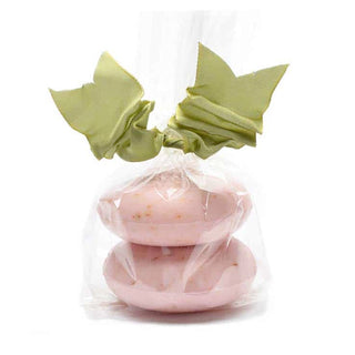 Two Rose Petal Bouquet Round French Soaps, 100 grams (approx 3.5 ounces) each, in a cello bag with wired ribbon.